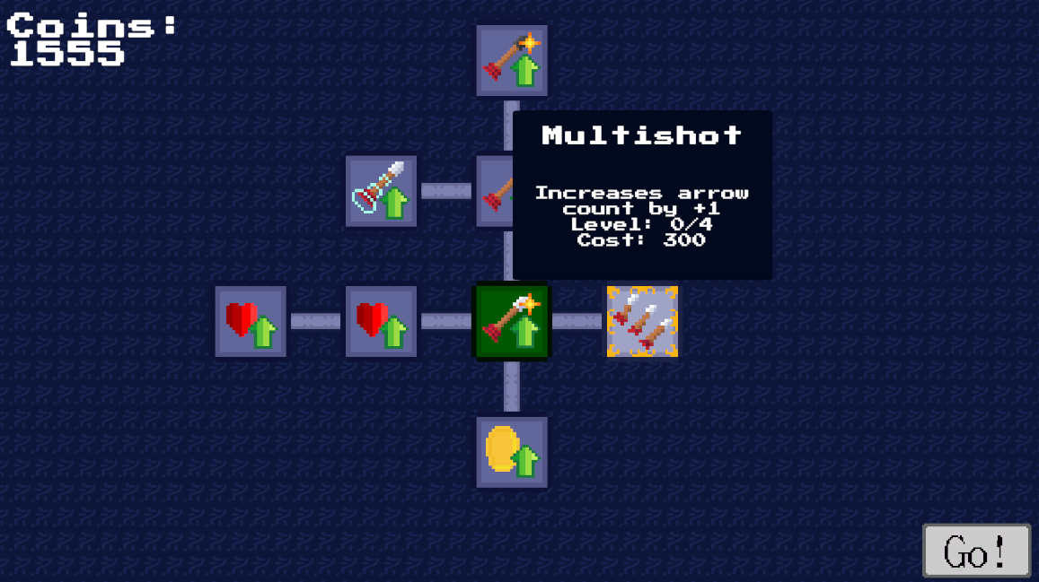 You are a lone archer going on an adventure into a cave to find treasure. The game consists of three levels, the forest, mountain pass, and finally the cave. Each level will spawn waves of enemies for you to take down earning coins in the process. Upon death you will be able to spend these coins to purchase valuable upgrades persisting through all future attempts.